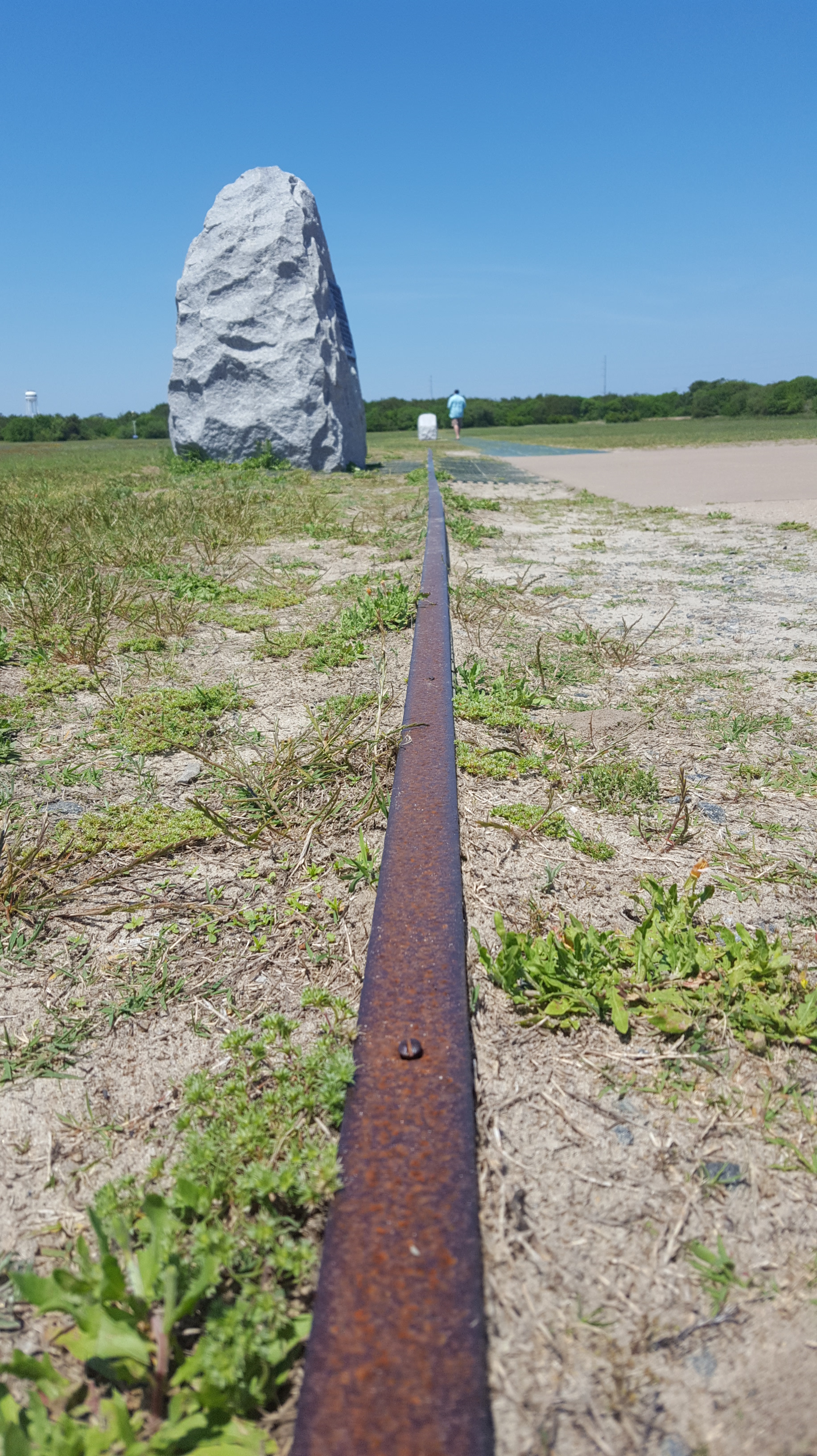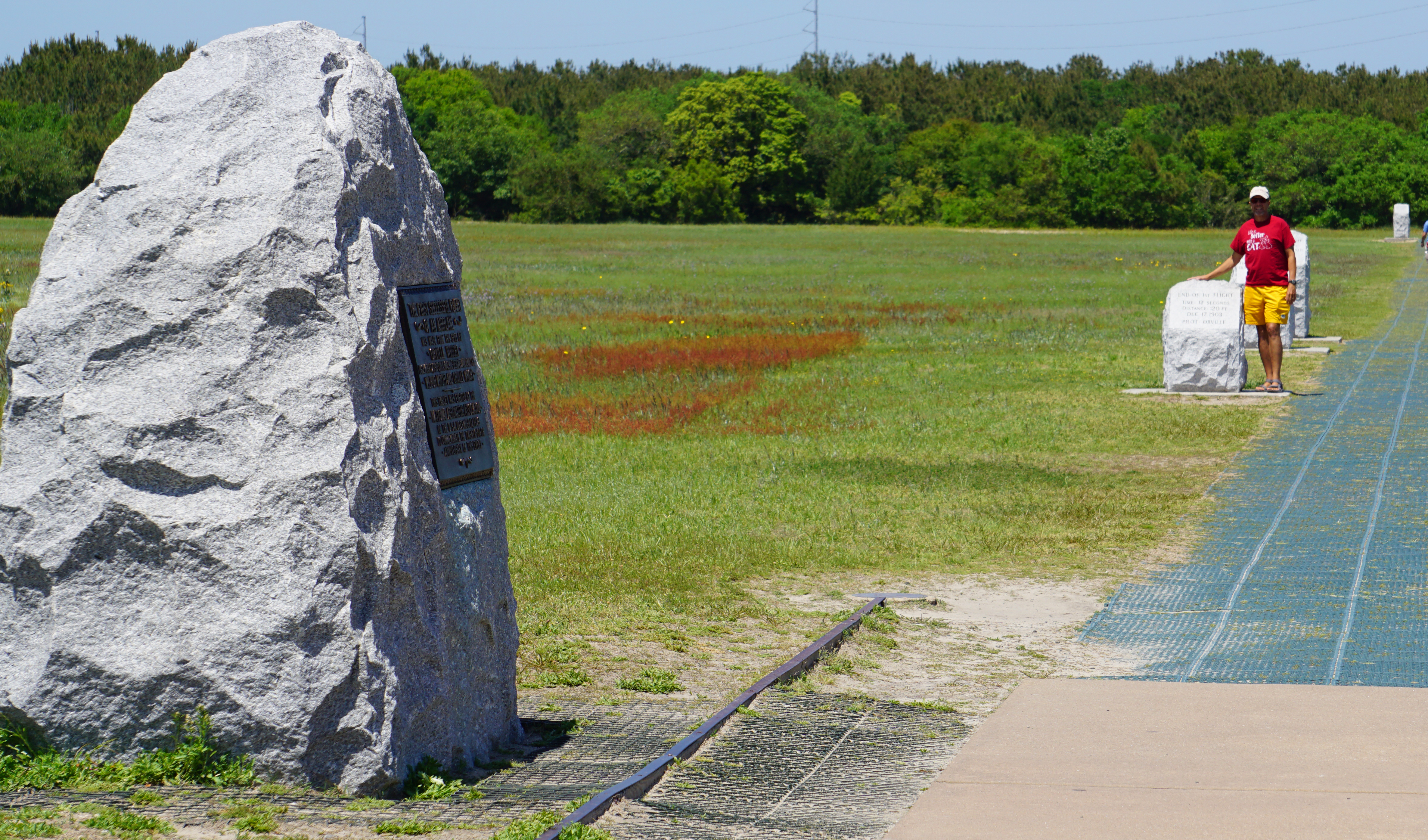 Out in the distance, 4 stones mark the landing points of each of their successively longer four flights that day. This is picture shows Craig at the touch down spot of the famous first flight, with the landings of flights 2, 3, and 4 behind me: