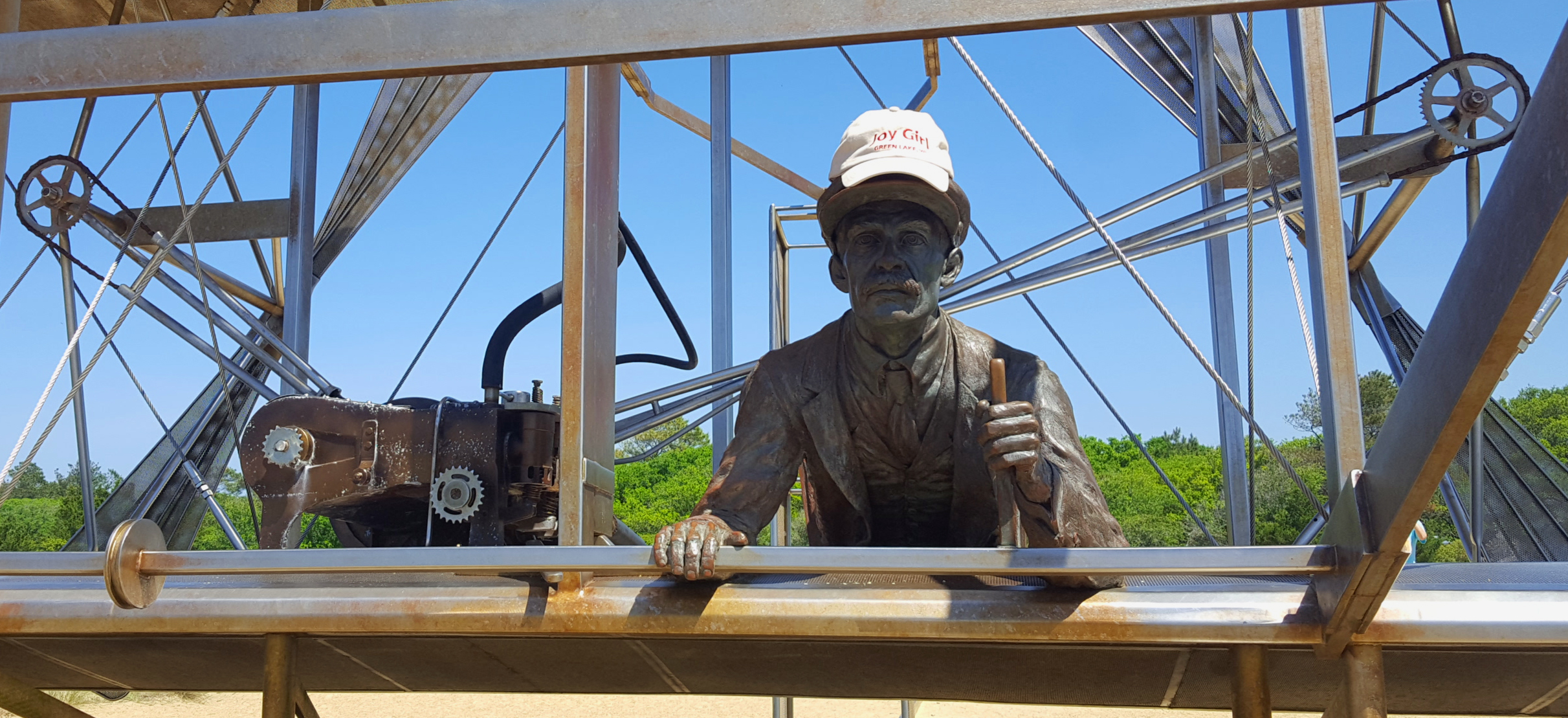 Several years ago while touring the Boeing factory in Everett, WA, I recall them saying that the fuselage of a 747 is so large in both length and breadth that the Wrights could have completed their entire flight inside of the jumbo jet! A lesser known fact is that enhanced images of that flight suggest that pilot Orville may well have been wearing a hat from the vessel Joy Girl: