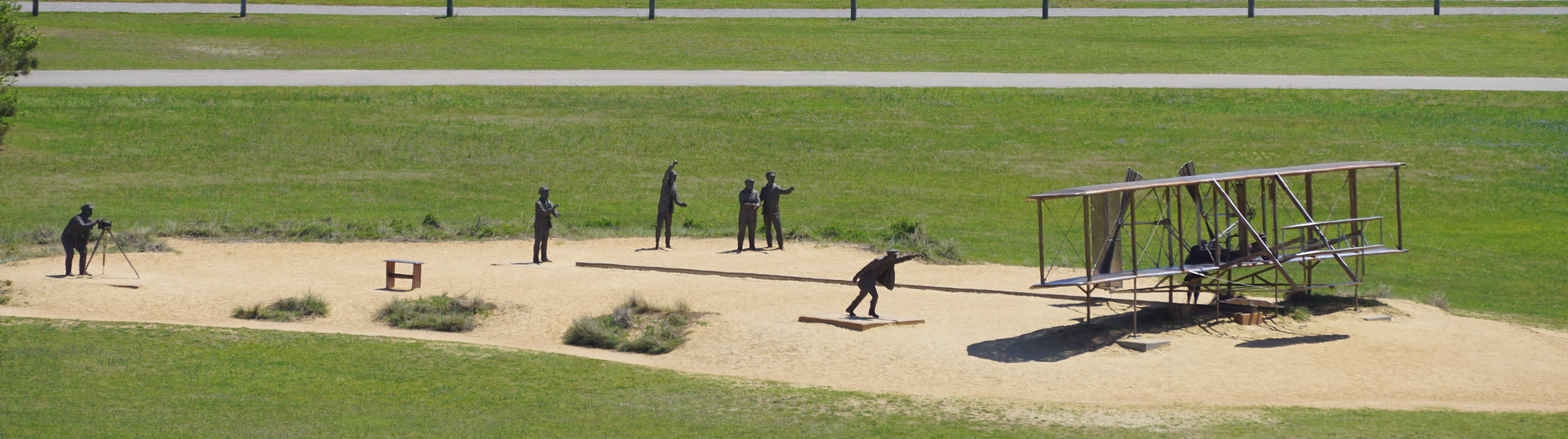 In addition to the life size recreation of the famous (and I believe only) photo of the historic event, the National Park Service Wright Memorial includes a placard at the very spot from which their aircraft first became airborne, reconstruction of their 1903 workshop, living quarters, and hangar, as well as a full scale model of the rail from which they launched their flyer.