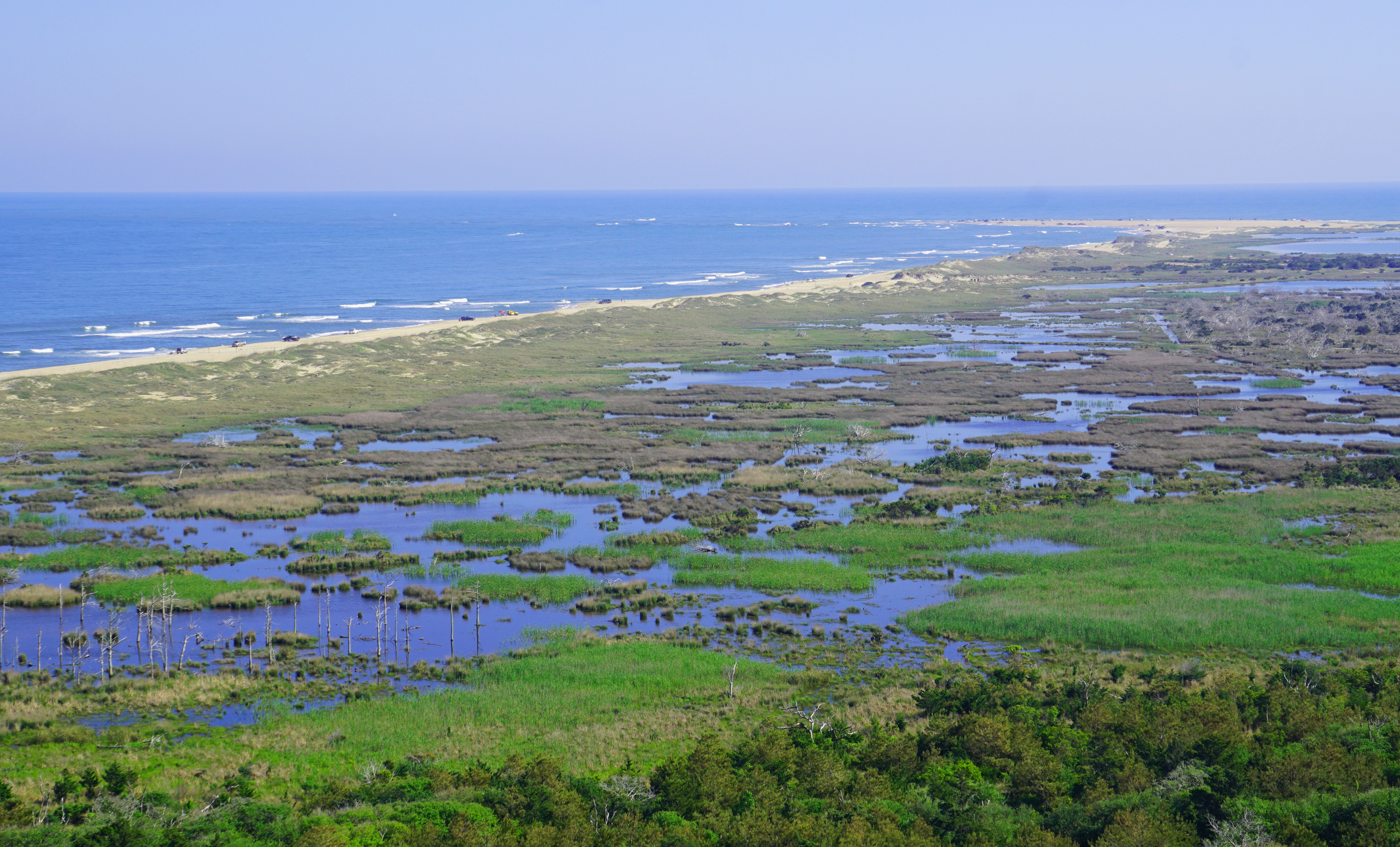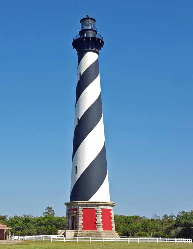 Climbing the light involves 258 steps, roughly the equivalent of going up a twelve story building, in a dizzying spiral around the perfectly cylindrical interior of the tower (the cylinder, inside the conical exterior, is some of what gives the lighthouse its strength). It took some breathing to get our aging bodies up there, but the view from the top, well, it took our breath away and was definitely worth the effort. No picture can do it justice, of course, but we’ll leave you with this shot looking out over the tip of Cape Hatteras and hope that someday you will be able to take in this view in person: