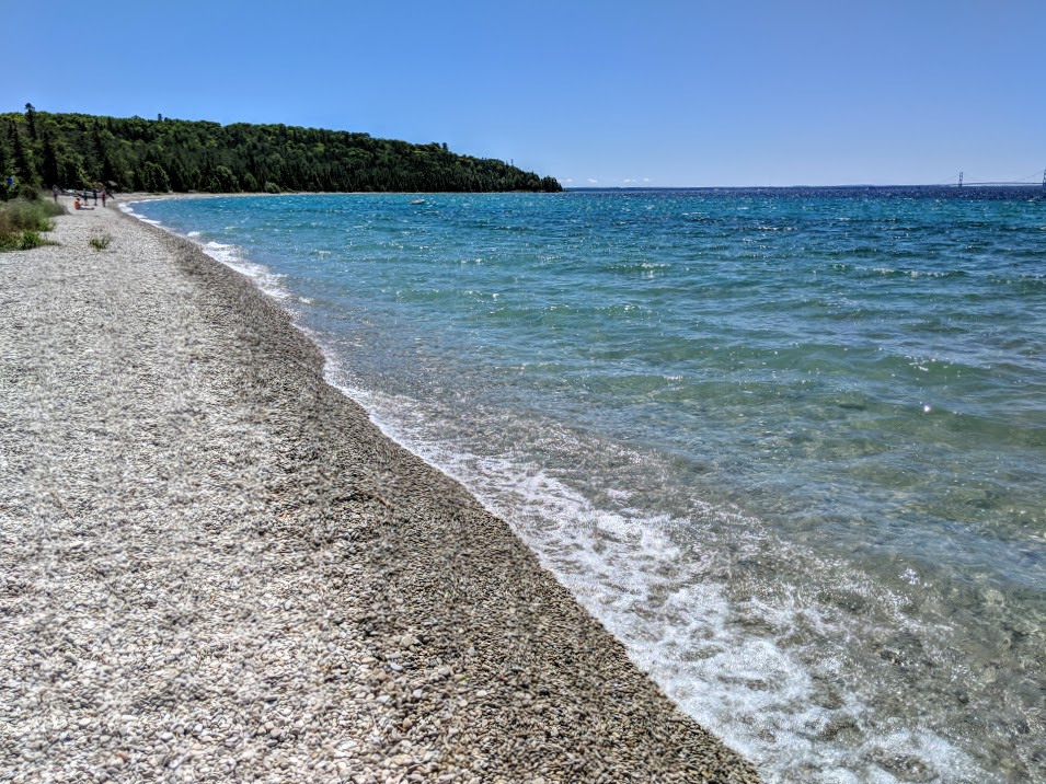 Mackinaw beach with bridge in background