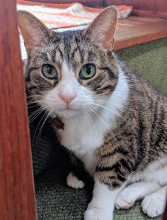 They ran around comfortably like they were home and happily scratched their backs on the carpet. When Craig started the engine, Admiral Roswell did not flee to the lower regions in terror, hallelujah. And this time we brought seasickness pills for Supreme Commander Scully-when I take mine, she’ll get a dose, too.