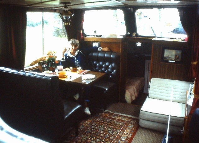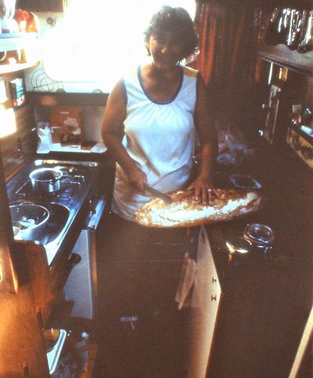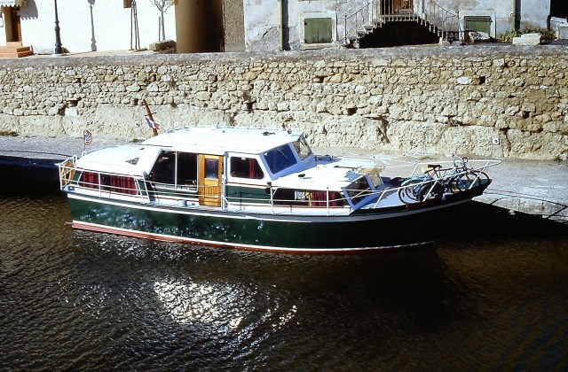My folks knew about the book because they cruised the canals of southern France in 1986. Mom was 50 and Dad was 57 – pretty close to us at 56 and 59. They spent a year planning their cruise and looking at boats in those old black and white books a French boat broker sent them. Then they withdrew a chunk of cash from the bank, closed up their home, and flew to France. They spent a year as boaters and my Dad still misses those days. We looked at their slides on my recent trip home and the similarities are pretty amazing. We had fun recreating her photos below 🙂