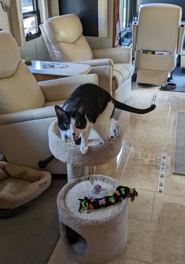 We sedate Roswell on travel days. He’s still scared but he doesn’t howl like he did on Joy Girl, so he copes better in the land yacht. He recovers quickly once we stop for the night. He’s got a “mad on” for me-at home he sleeps in the crook of my arm most nights, but now he keeps his distance at the end of the bed. Hey, I get it. I was mad at my folks when they dragged us around the world in my teens. But I bet Roswell will forgive me faster than I forgave them. Love you, Mom!